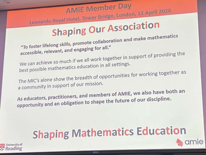 So what is AMiE? Andy described maths as a ‘broad and rich landscape’ and AMiE as a ‘home’. A place for us to feel encouraged and supported, and where experience is valued, and pointedly, where disagreement is constructive. He acknowledged the reality that the five founding organisations bring their own perspectives – AMiE is about bringing us together, and not about losing things; ‘not less depth but greater connection’.